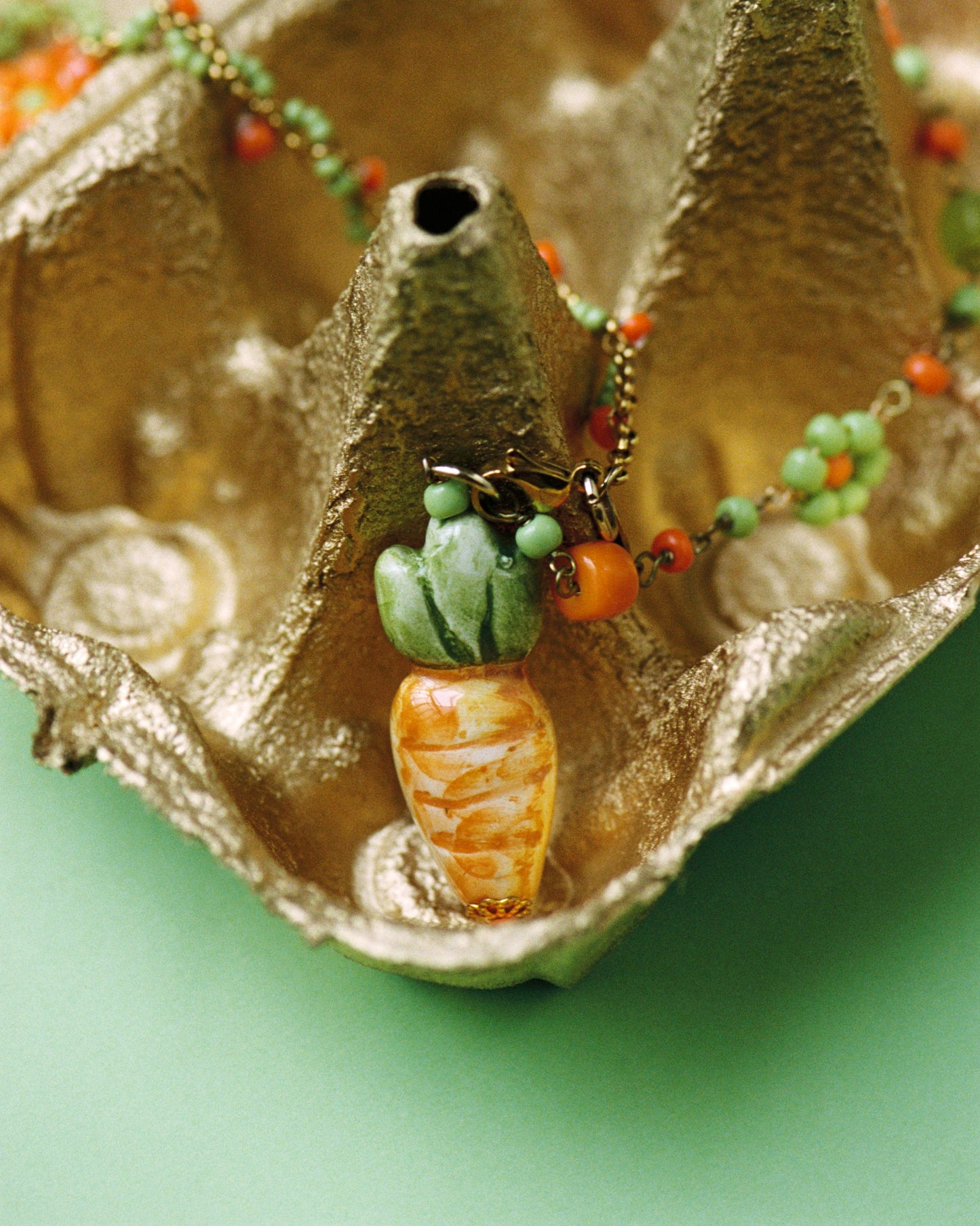 The Carrot Necklace is a playful ode to nature. Handcrafted with a delicate beaded chain in shades of green and orange, it’s adorned with a ceramic carrot charm, leafy details, and other beadwork carefully enameled by hand.