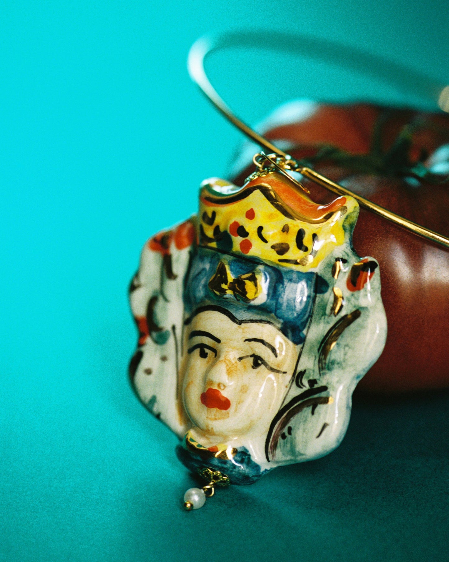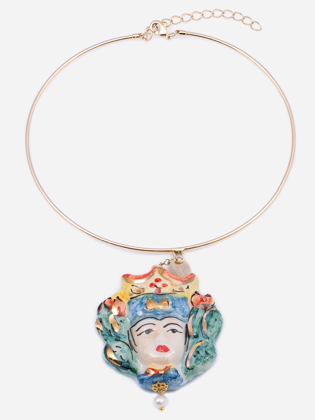 Featuring a rigid metal hoop and a hand-painted ceramic pendant depicting a queen adorned with floral details, this necklace is a powerful and sculptural piece.