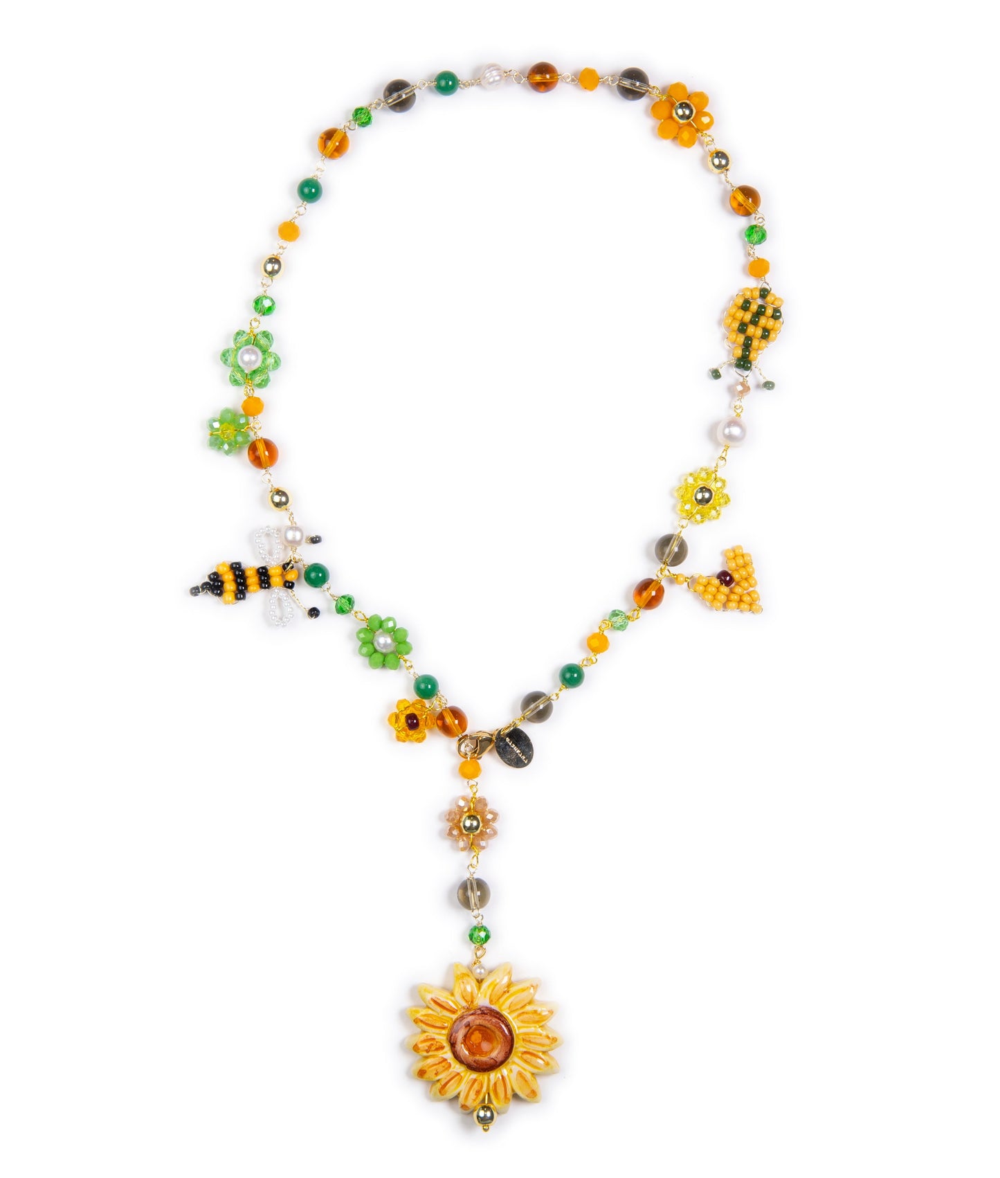 This long Girasol necklace is a sunny and joyful piece. Its centerpiece is a sunflower glazed in mustard, honey, and caramel tones, hanging from an asymmetrical chain adorned with crystal beads in leaf green, amber, smoky brown, and pearly white. Small details like glass bees, flowers, and organic textures evoke the vitality of a summer garden.