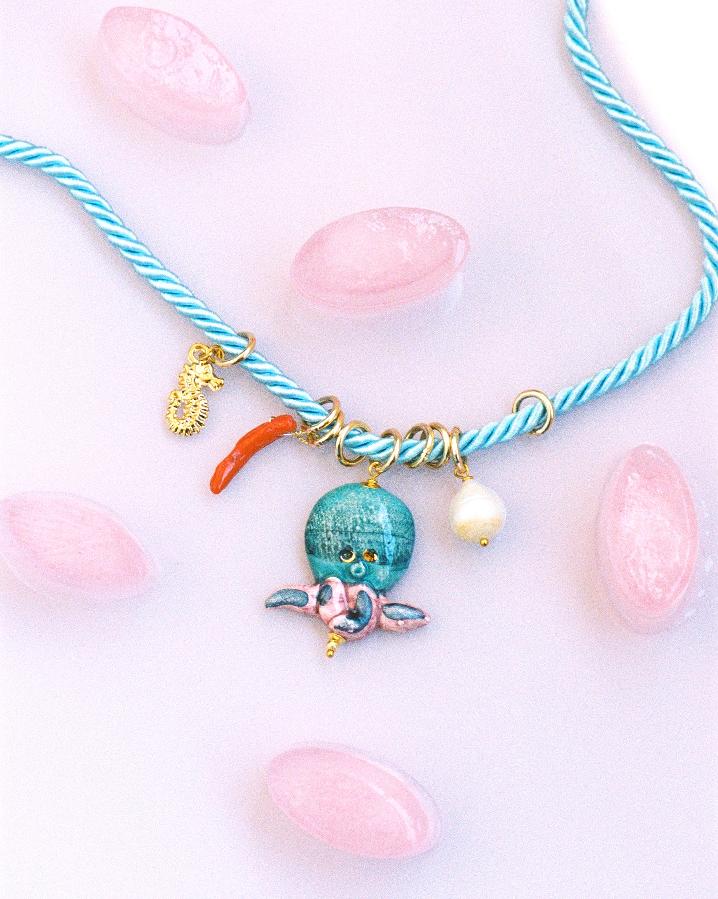 The Pulpo necklace is a breath of fresh air that takes you straight to the ocean depths. Its braided light blue cord evokes the gentle waves of a calm afternoon at the beach. But what truly steals the show are the charms: an octopus glazed in shades of blue and pink with an enchanting expression, accompanied by a red coral, a white pearl, a golden seahorse, and a decorative ring.