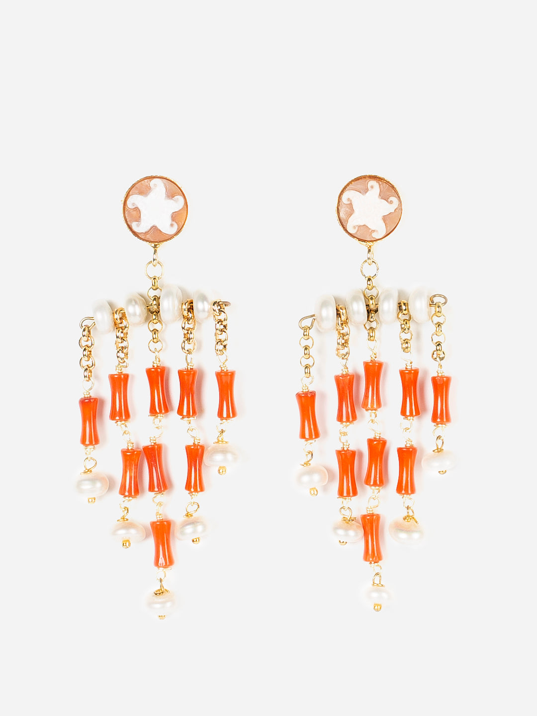 The top stud features a star carved in mother-of-pearl, followed by delicate gold chains with natural coral and pearl pendants, creating a vibrant and sophisticated cascading effect. They are lightweight yet vibrant, perfect for elevating any summer look or adding an exotic touch to a neutral ensemble. Ideal for those seeking pieces with character and reinterpreted tradition.
