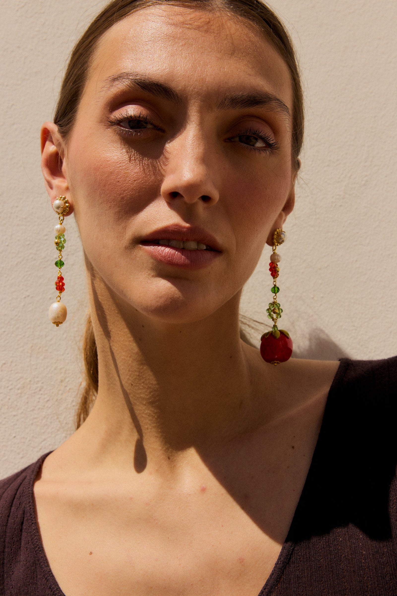 MINI POMODORO, TOMATO AND PEARL SHAPED CERAMIC LONG EARRINGS