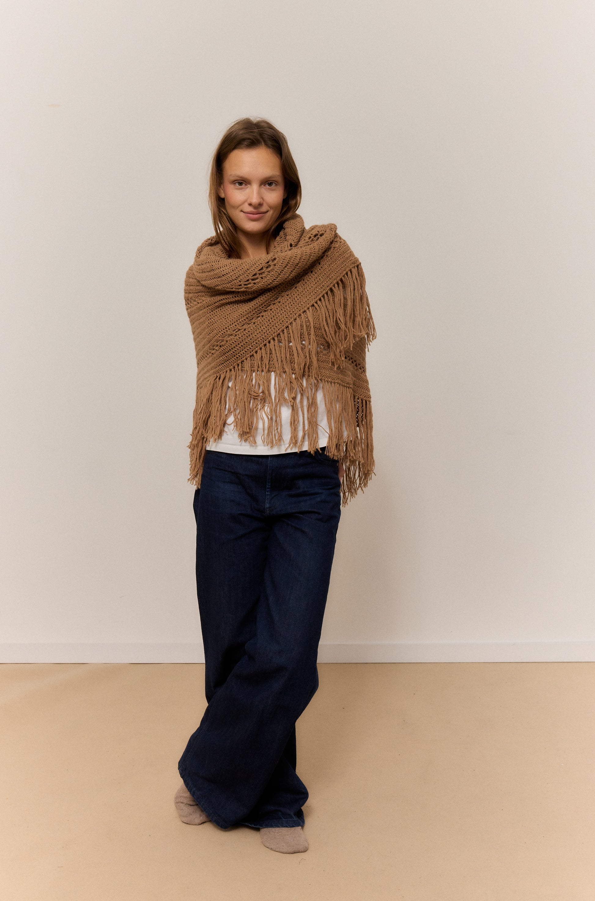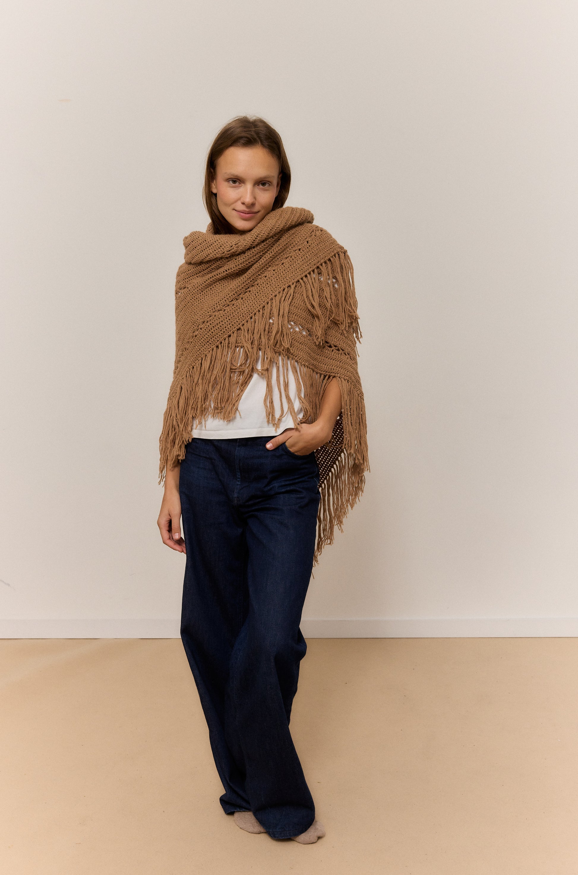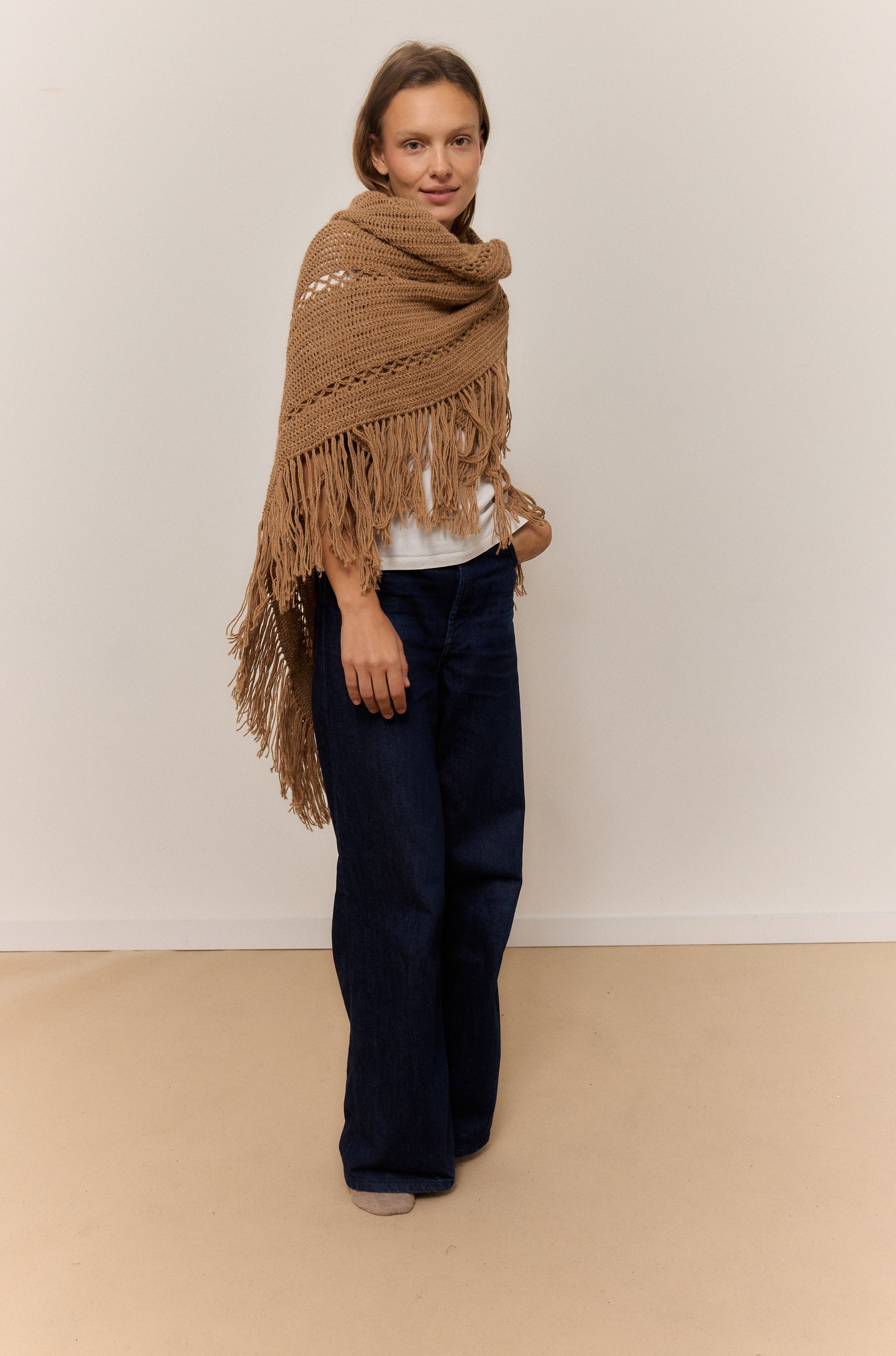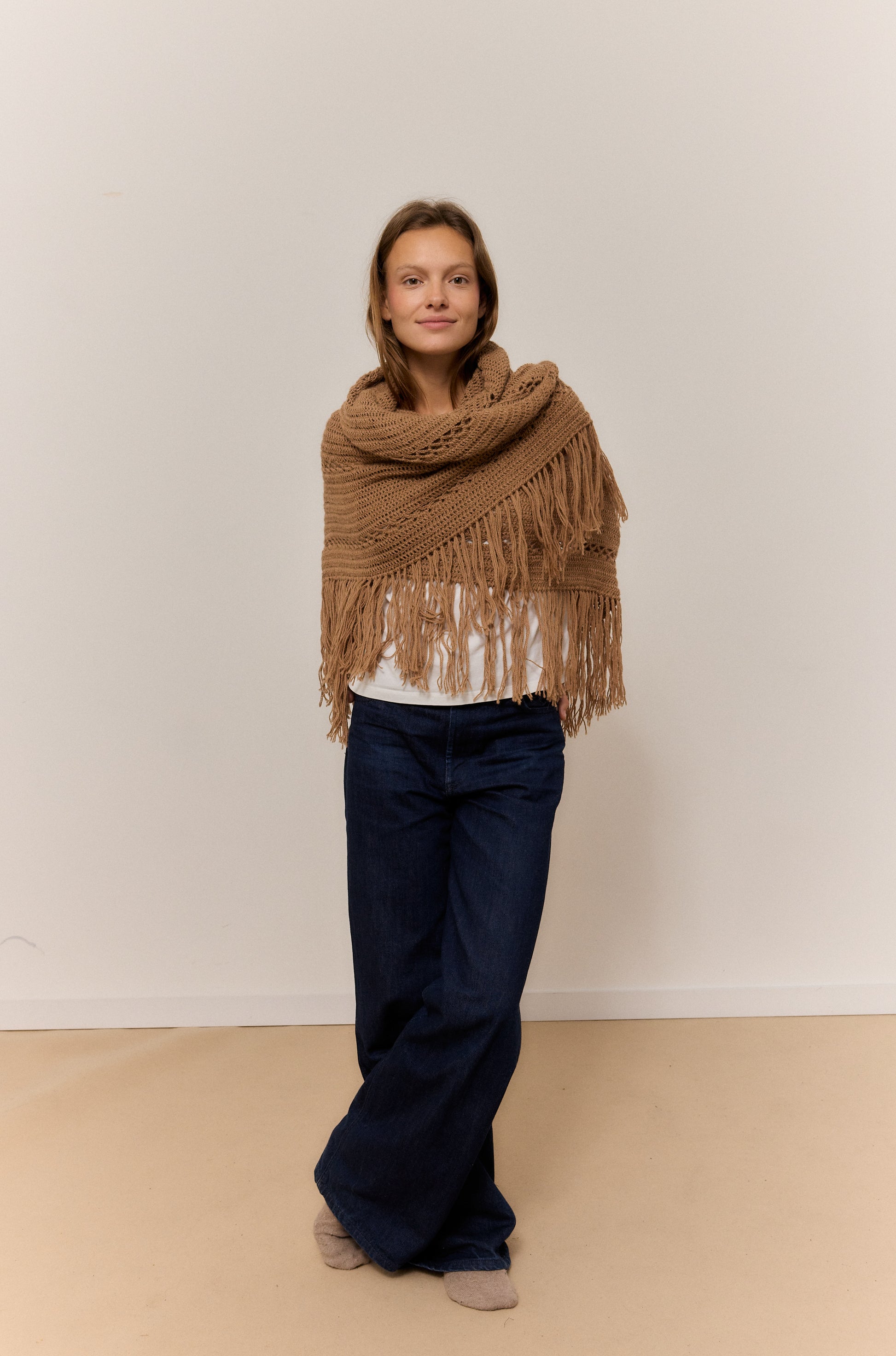Este chal almendra de lana 100% de alpaca, rematado con suaves flecos, es una invitación a abrazar la calma y el confort. Su textura ligera pero cálida envuelve como un susurro, perfecta para esos momentos en casa en los que el mundo se desacelera y solo apetece una taza caliente y buena música. El brillo natural de la fibra y su caída elegante aportan un toque de refinamiento sin esfuerzo, mientras su tacto suave convierte cada gesto en una caricia. Versátil y atemporal, se adapta con la misma gracia a un paseo por la ciudad que a un evento especial, elevando cualquier conjunto con su elegancia natural. Una pieza pensada para disfrutar del mood cozy con estilo y autenticidad.