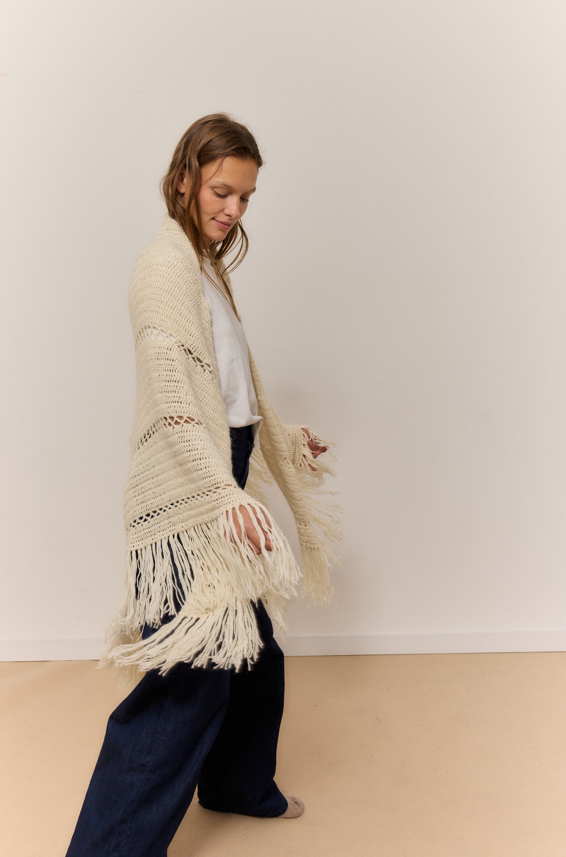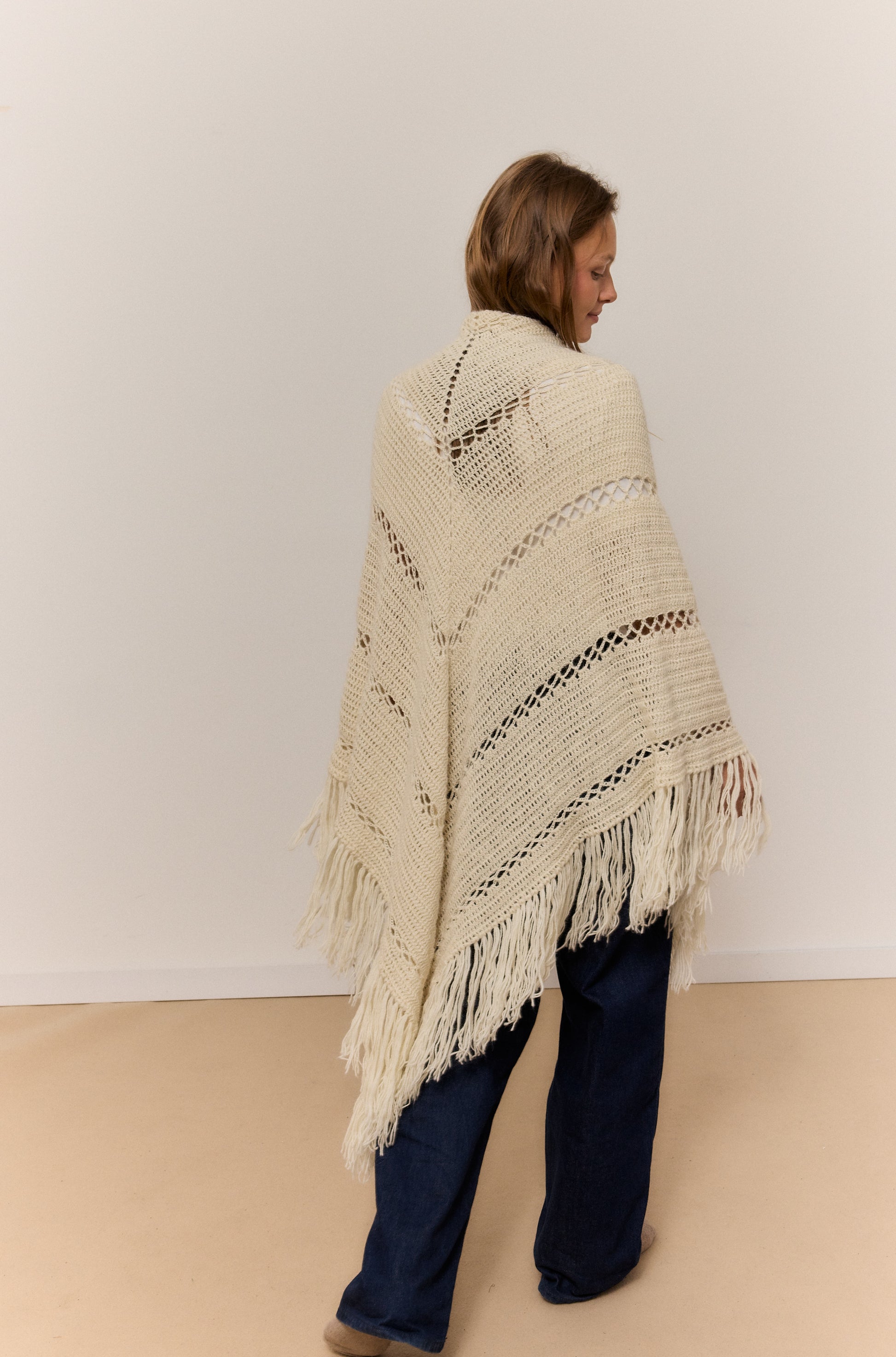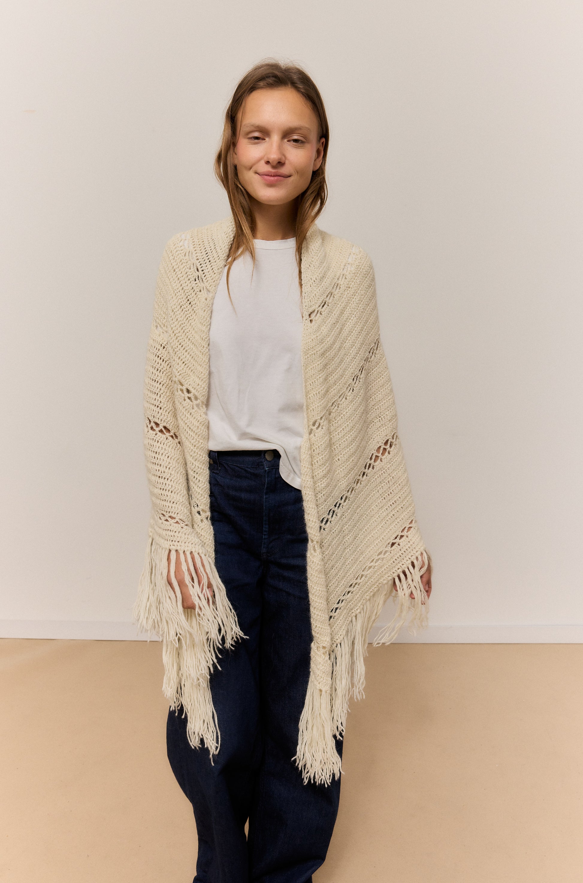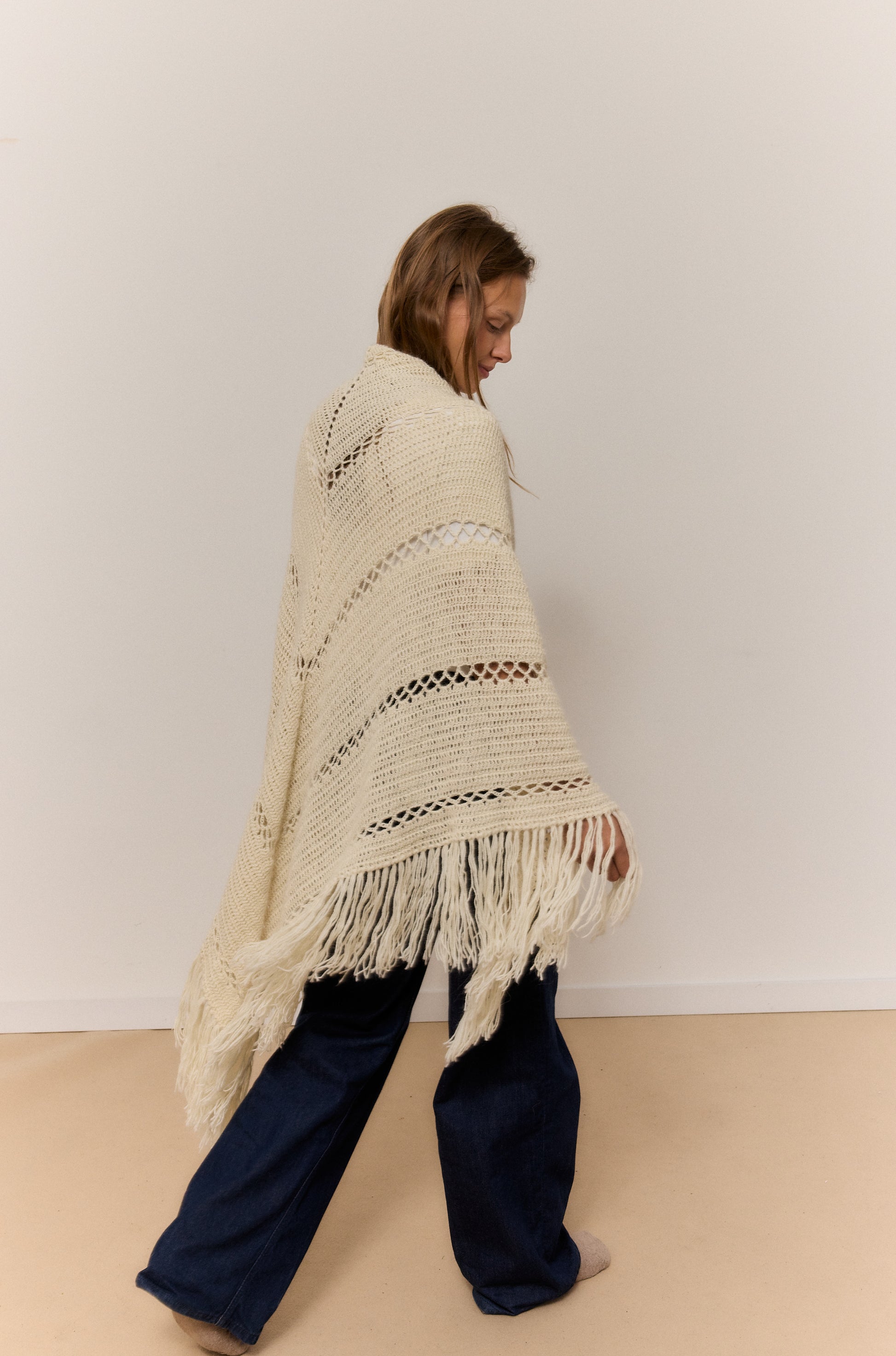 Este chal arena de lana 100% de alpaca, rematado con suaves flecos, es una invitación a abrazar la calma y el confort. Su textura ligera pero cálida envuelve como un susurro, perfecta para esos momentos en casa en los que el mundo se desacelera y solo apetece una taza caliente y buena música. El brillo natural de la fibra y su caída elegante aportan un toque de refinamiento sin esfuerzo, mientras su tacto suave convierte cada gesto en una caricia. Versátil y atemporal, se adapta con la misma gracia a un paseo por la ciudad que a un evento especial, elevando cualquier conjunto con su elegancia natural. Una pieza pensada para disfrutar del mood cozy con estilo y autenticidad.
