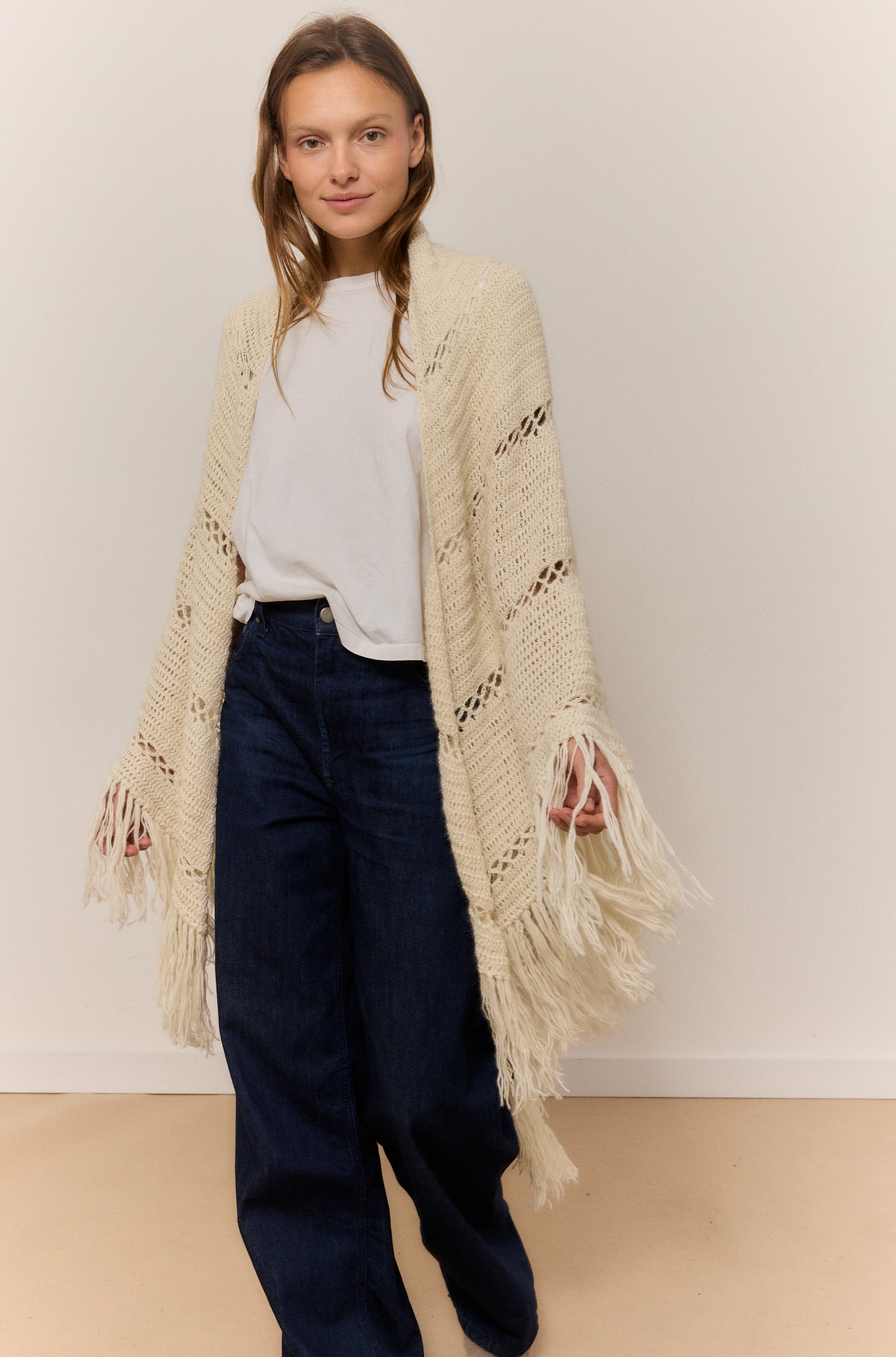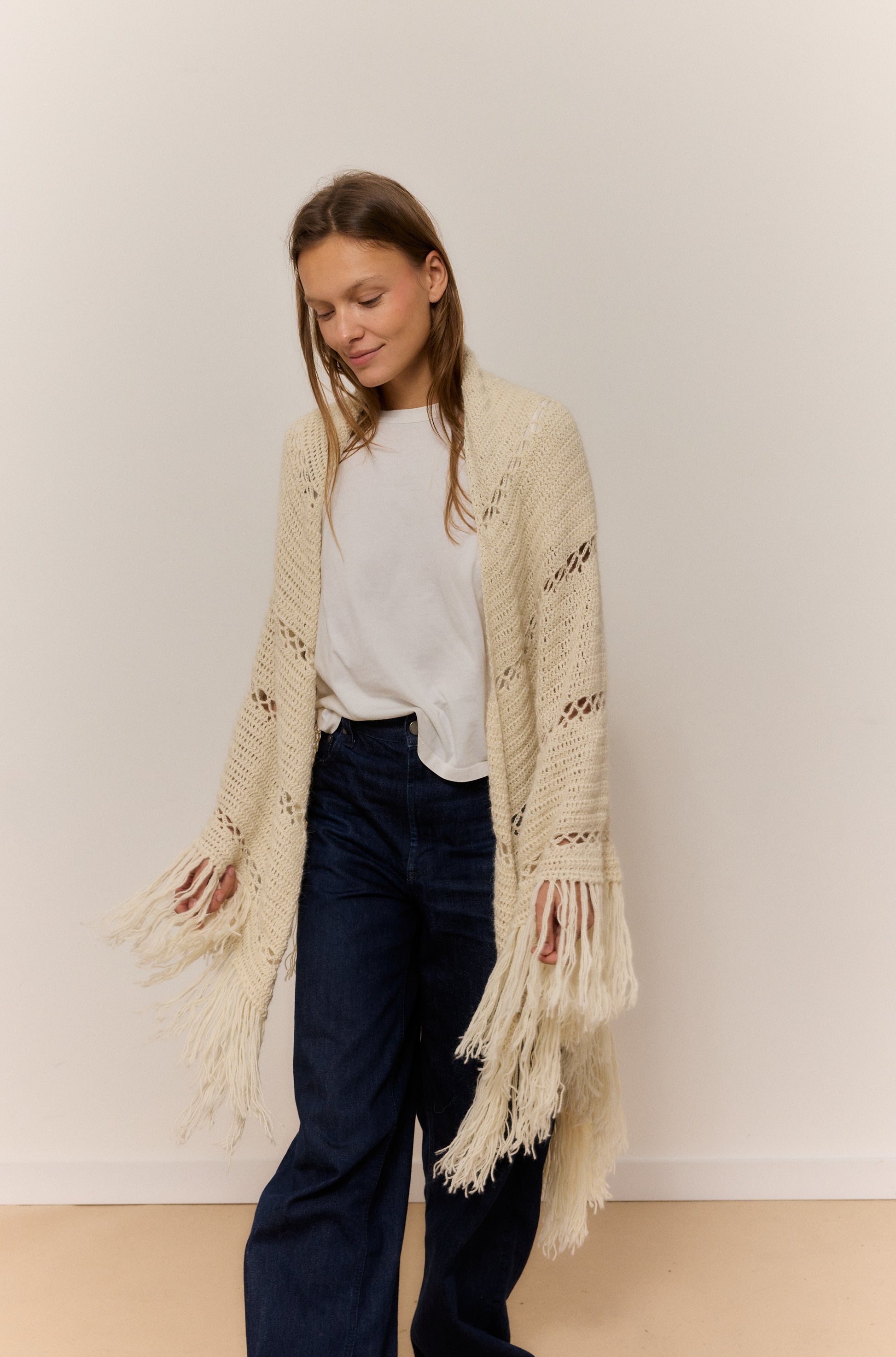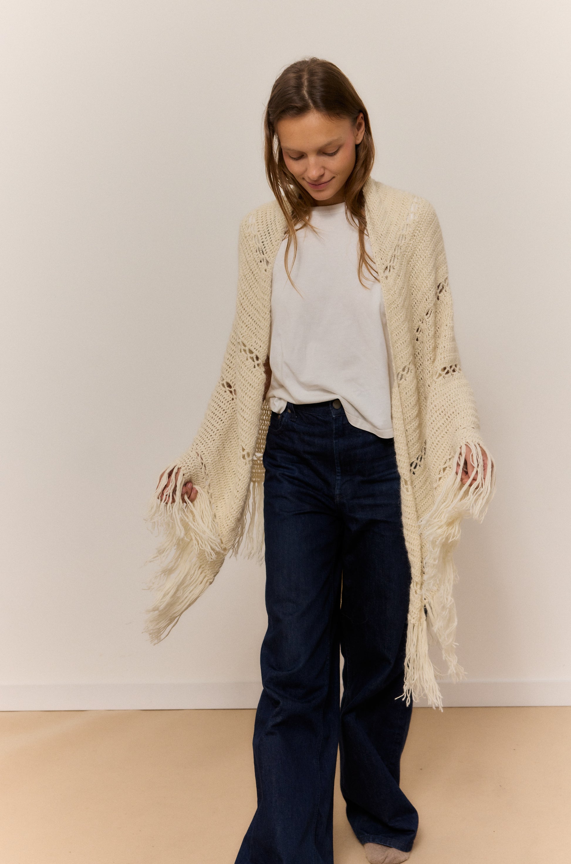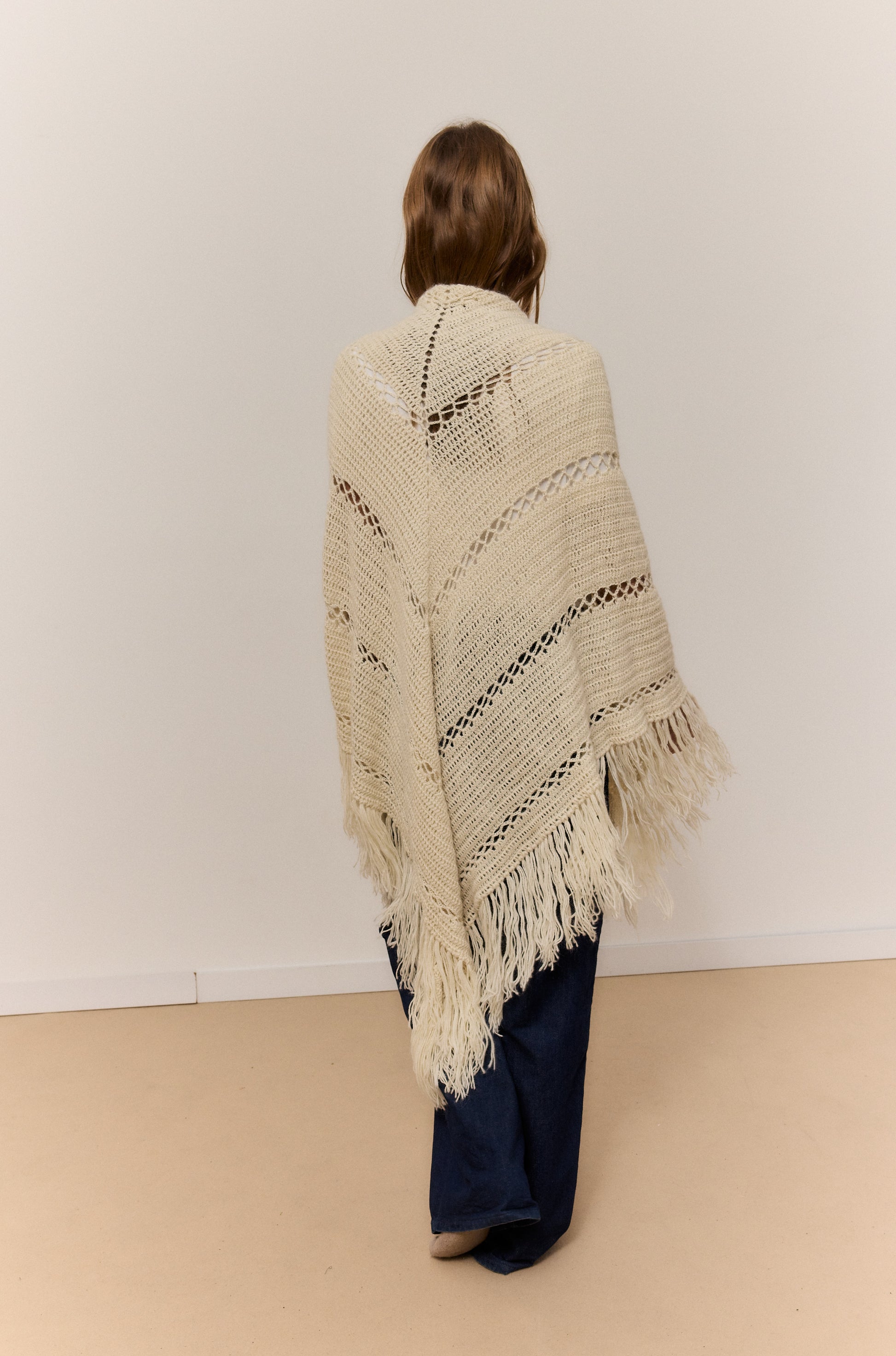 Este chal arena de lana 100% de alpaca, rematado con suaves flecos, es una invitación a abrazar la calma y el confort. Su textura ligera pero cálida envuelve como un susurro, perfecta para esos momentos en casa en los que el mundo se desacelera y solo apetece una taza caliente y buena música. El brillo natural de la fibra y su caída elegante aportan un toque de refinamiento sin esfuerzo, mientras su tacto suave convierte cada gesto en una caricia. Versátil y atemporal, se adapta con la misma gracia a un paseo por la ciudad que a un evento especial, elevando cualquier conjunto con su elegancia natural. Una pieza pensada para disfrutar del mood cozy con estilo y autenticidad.