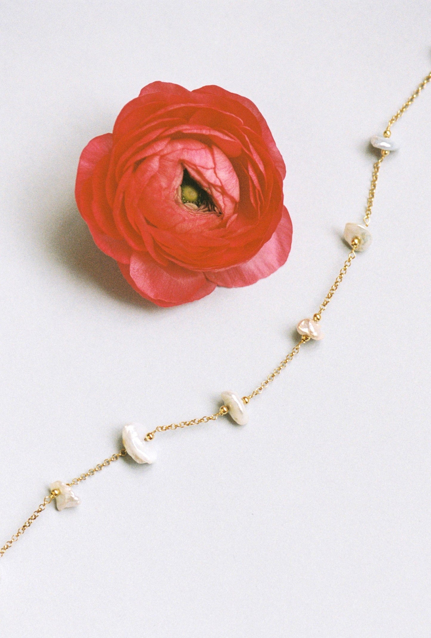 Perlas con formas libres que no siguen reglas, enlazadas en una cadena dorada que atrapa la luz y las miradas.