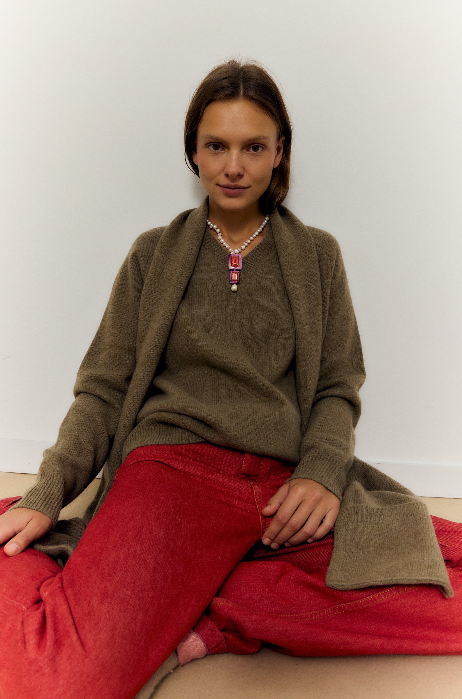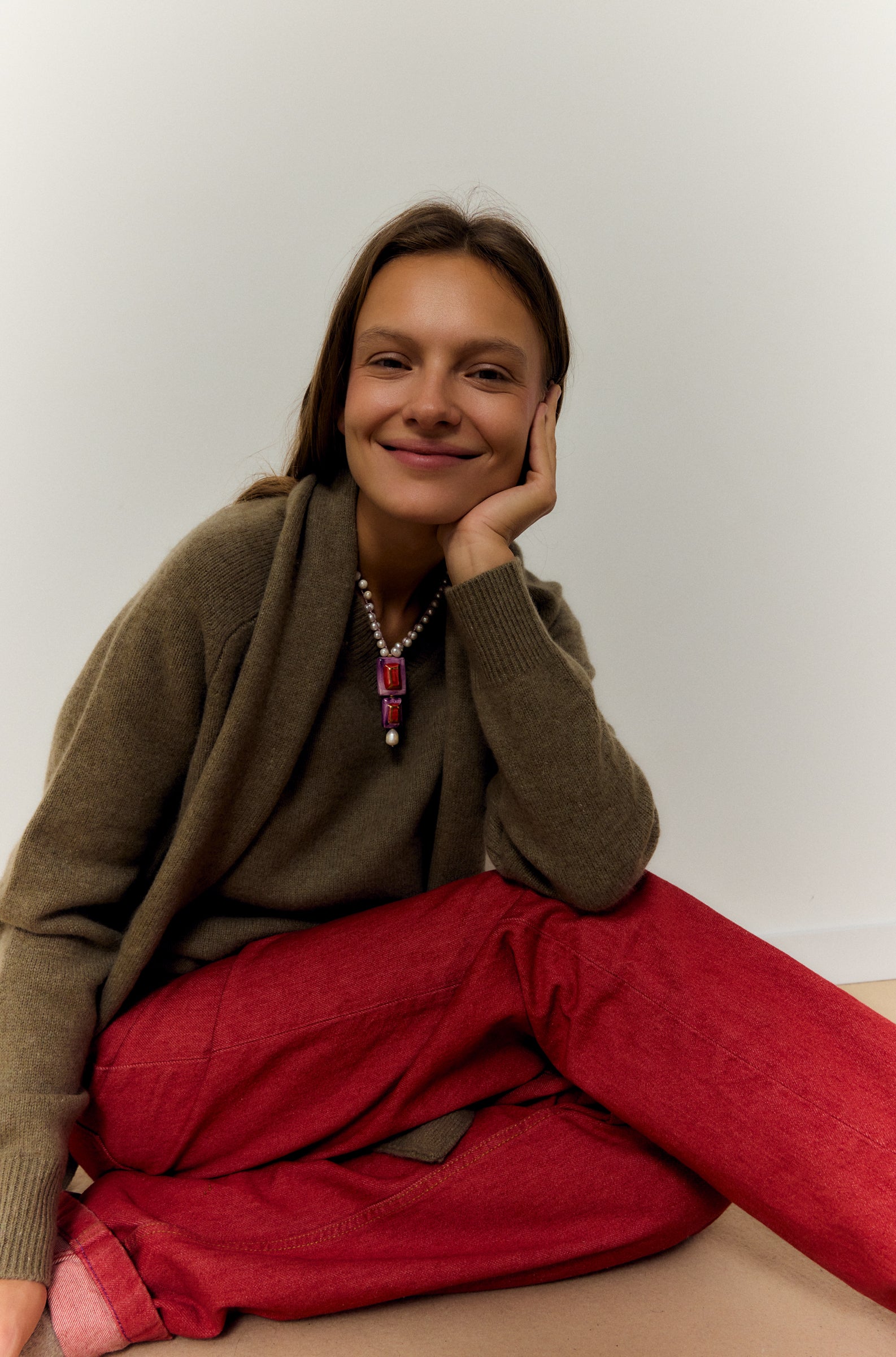 Una cadena de perlas luminosas aporta la base clásica y refinada, mientras en el centro dos piezas de cerámica pintadas a mano, en rojo vibrante y lila etéreo, se convierten en protagonistas. La unión de estos tonos crea un equilibrio inesperado: la fuerza apasionada del rojo junto a la serenidad soñadora del lila.
