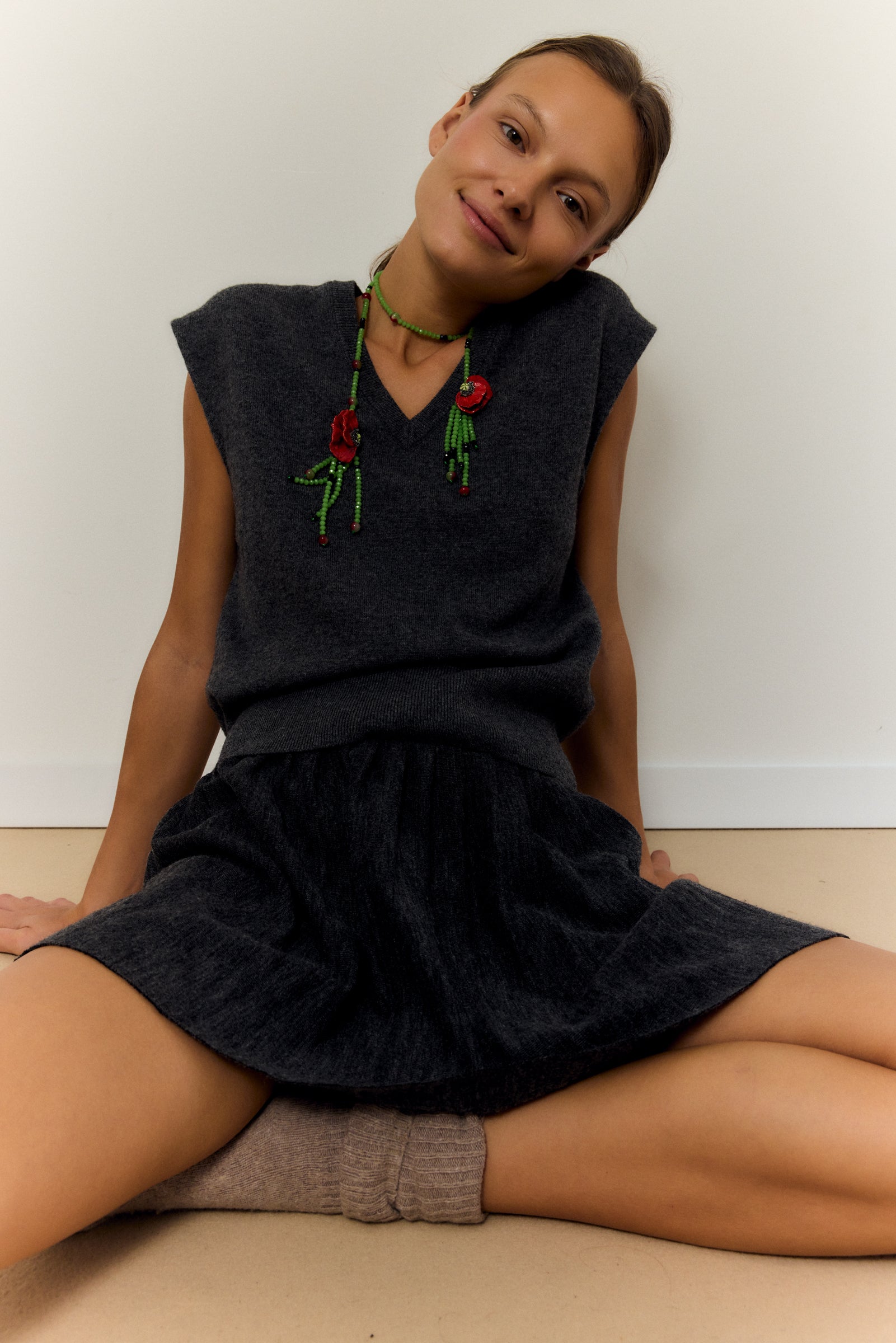 Hecho a mano en Italia, el Collar Media Amapola es una joya creativa y sofisticada que combina una sola cadena de cuentas en fila, en tonos verde y negro, con dos piezas de cerámica en forma de media amapola. Al colocarlo, las dos medias amapolas se encuentran en la parte delantera, formando una flor completa que se convierte en el protagonista del diseño.