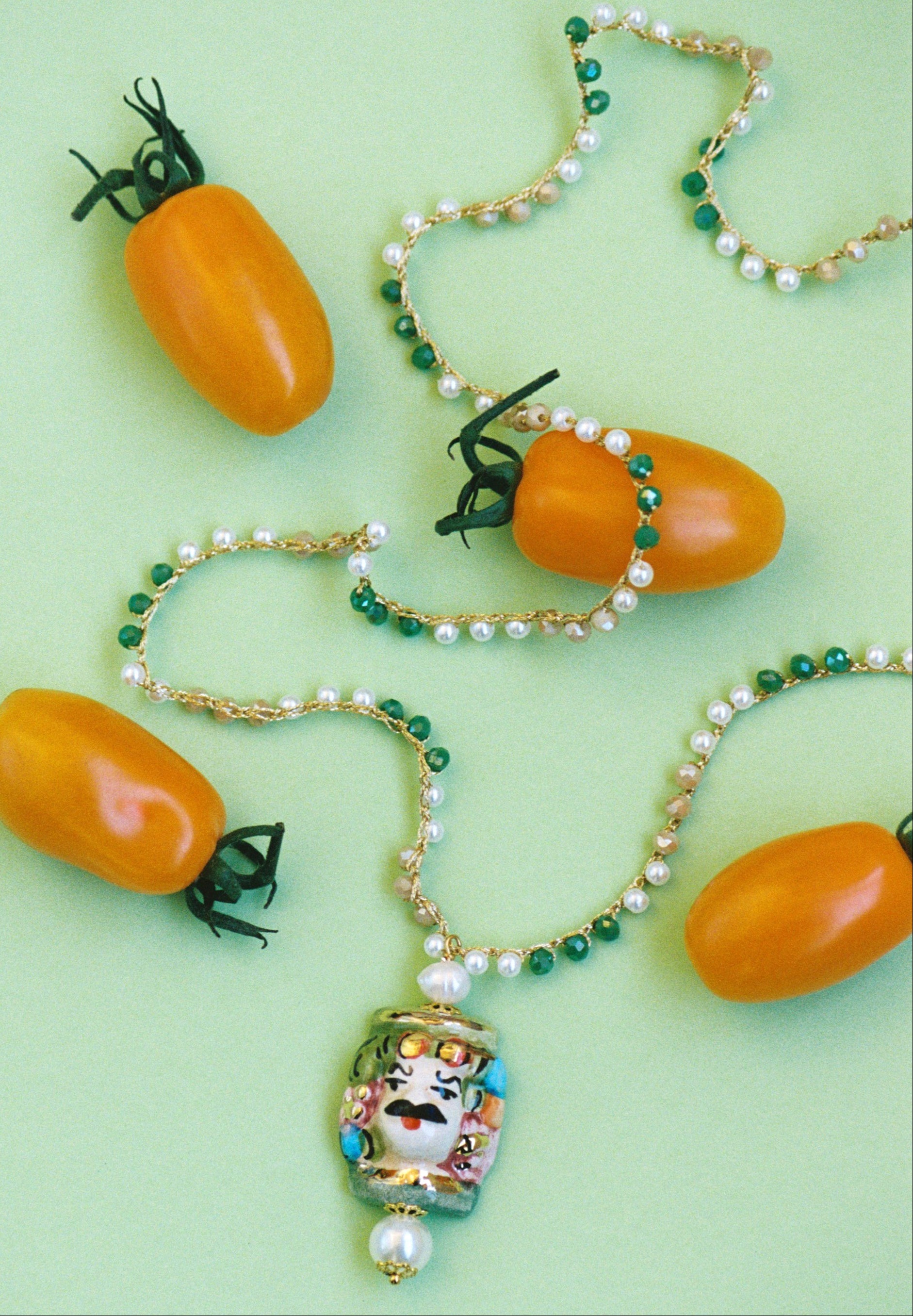 El Collar Salvatore es una joya cargada de carácter mediterráneo y espíritu artesanal. Compuesto por una cadena larga en doble vuelta, hecha a mano con pequeñas cuentas de cristal en verde oliva y perlas, este diseño combina frescura y tradición. El protagonista absoluto es el colgante de cerámica siciliana: una cabeza masculina pintada a mano con expresión serena, corona dorada y detalles florales sutiles que evocan la historia y estética barroca del sur de Italia.