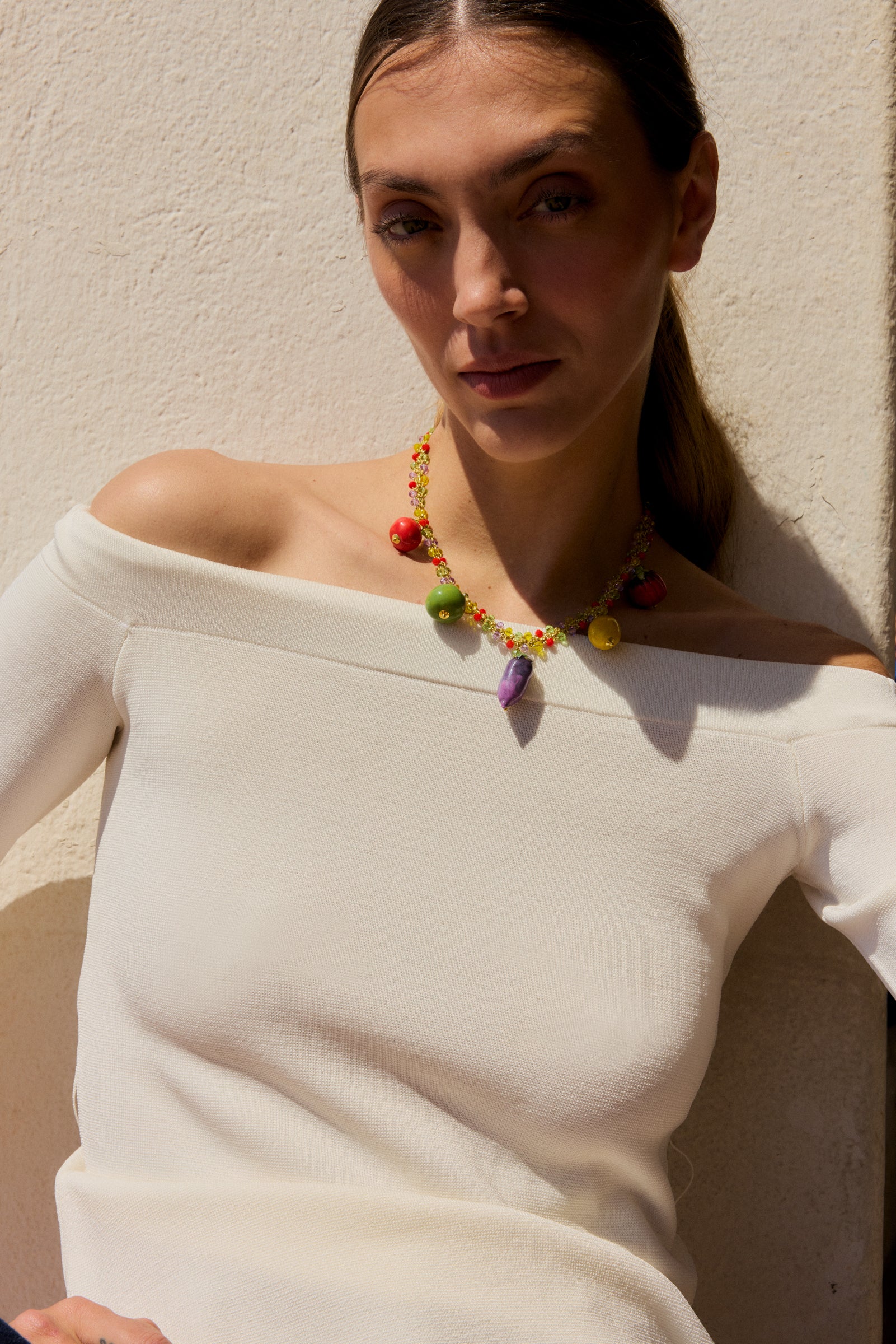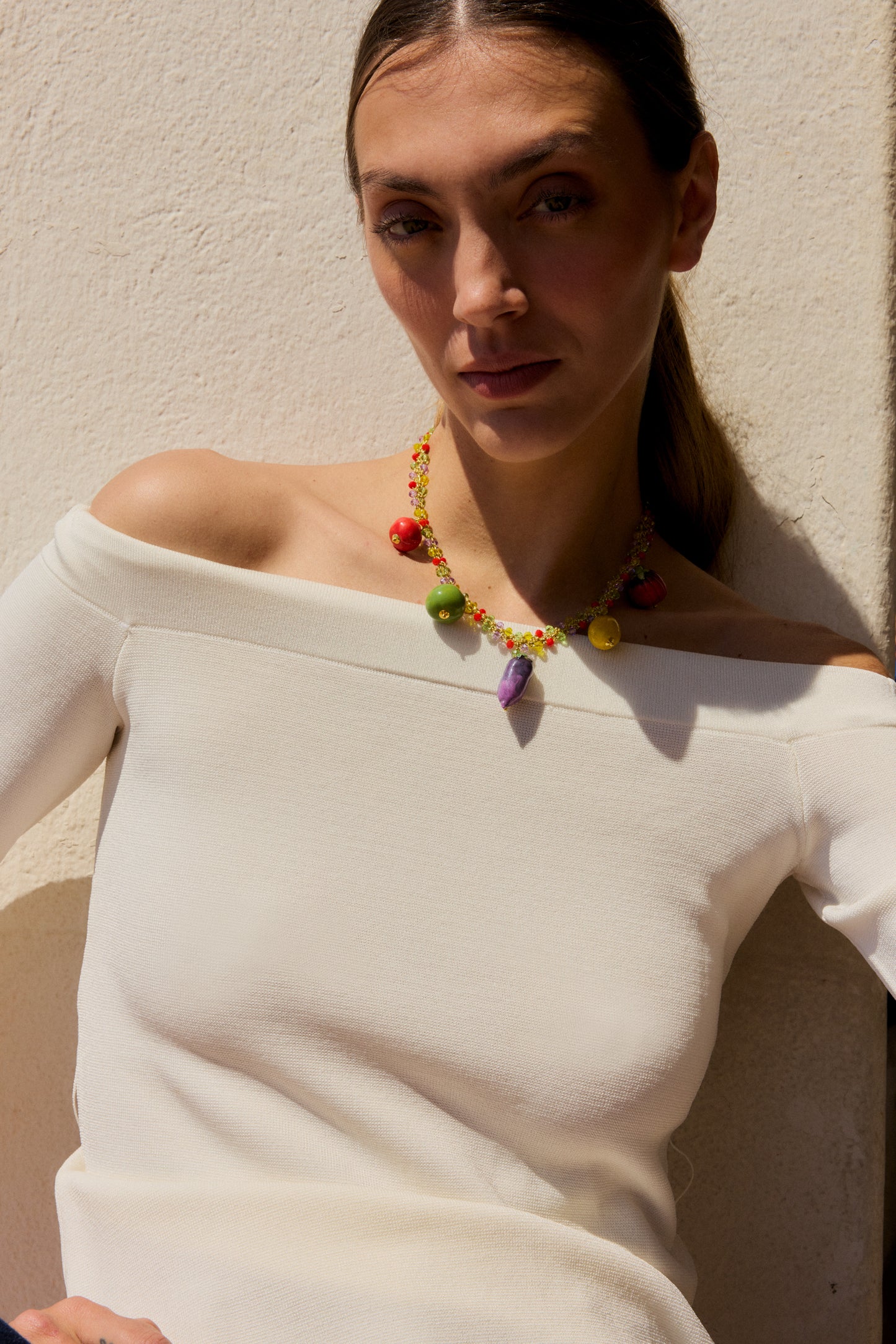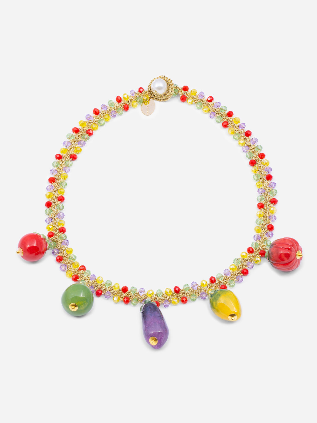 Hecho a mano en Italia, el Collar Tutti Pomodoro es una celebración de color, sabor y estilo. Su cadena de crochet, tejida con cuentas de diversos colores, da soporte a cinco encantadores colgantes de cerámica: dos tomates rojos, un tomate verde, uno amarillo y una berenjena central que roba todas las miradas.