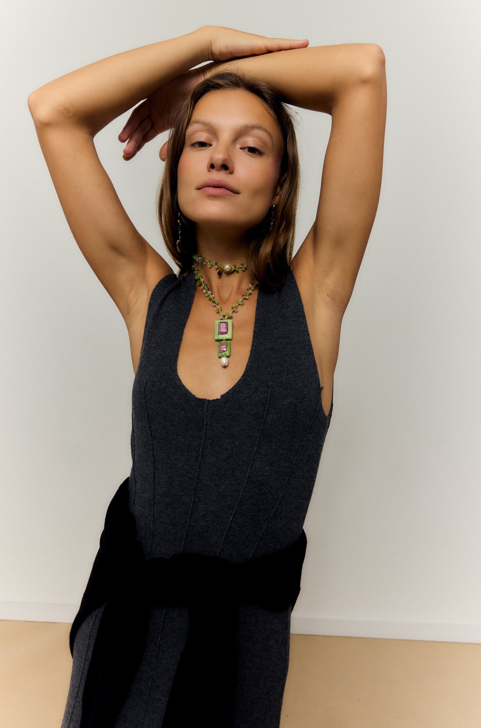 La cadena de crochet acoge una danza de cuentas verdes y amatistas que se entrelazan con suavidad, como hojas y flores al caer la tarde. En el centro, dos piezas de cerámica pintadas a mano revelan un juego de colores profundos y vibrantes, convirtiéndose en el corazón doble de este collar.