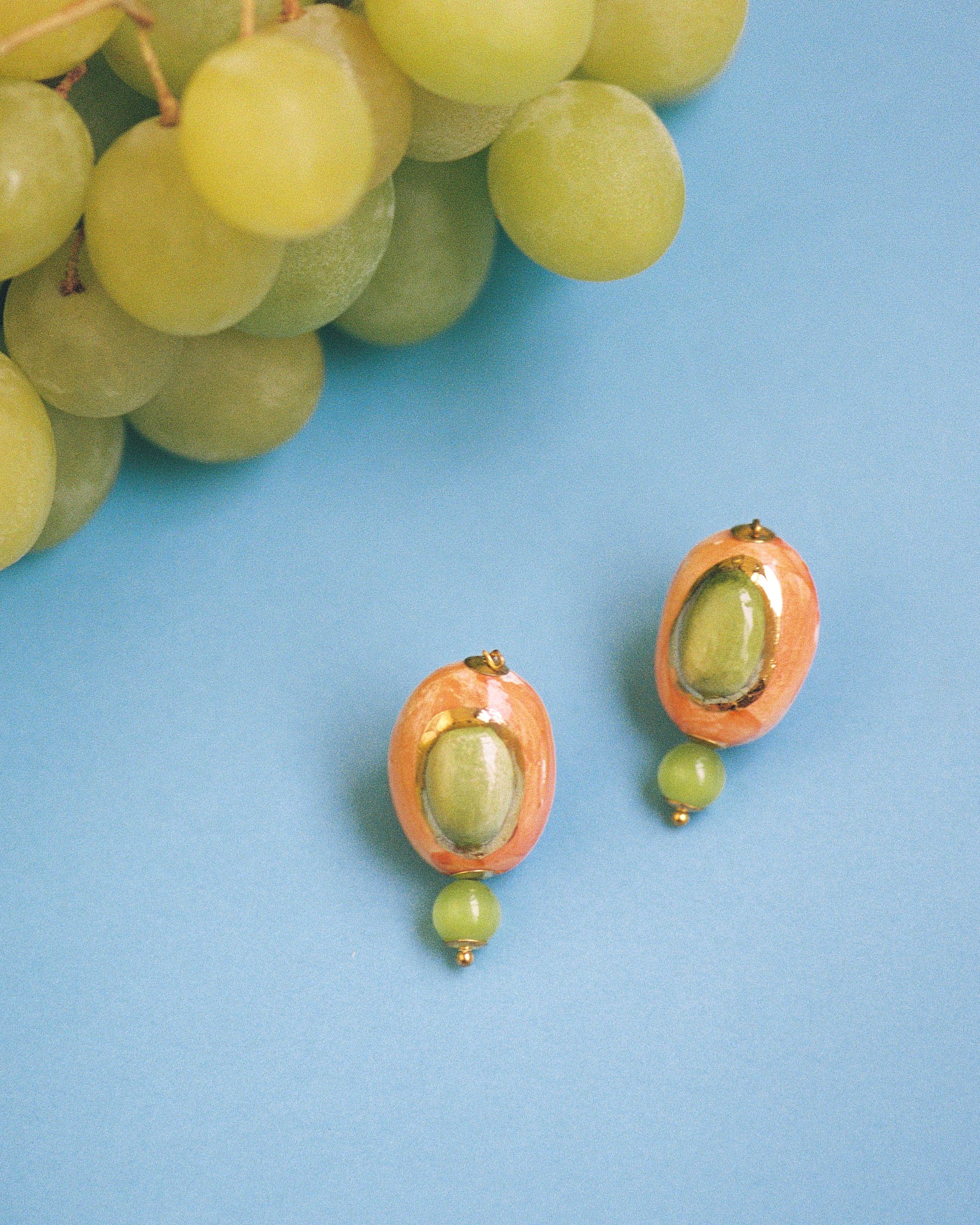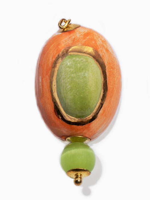 Estos pendientes en tonos verdes y naranjas reúnen un diseño delicado, lleno de frescura y vitalidad. La pieza central, una gema de cerámica pintada a mano, concentra en su interior la magia de los colores de la naturaleza: el verde de la hoja, el naranja del fruto.