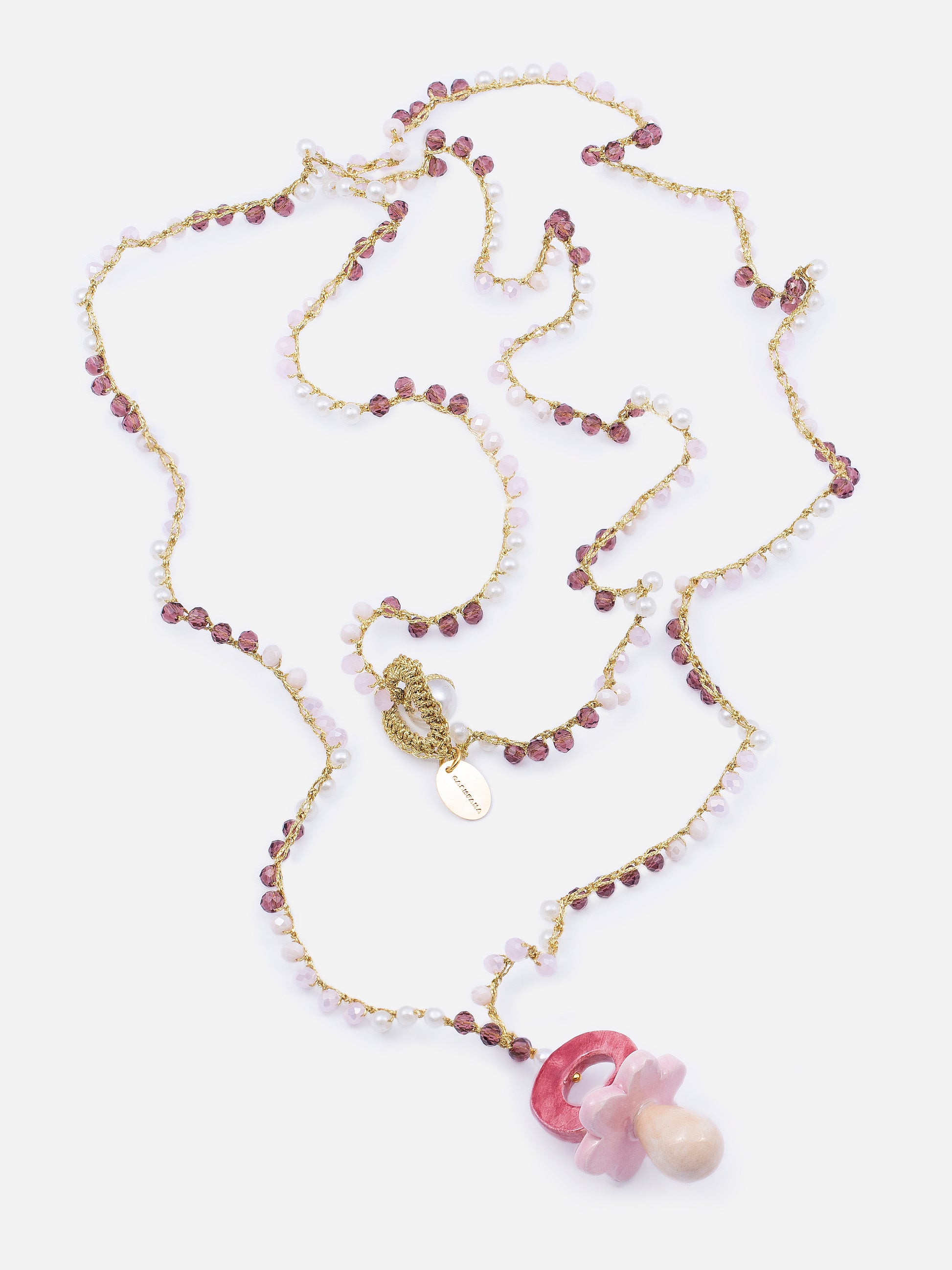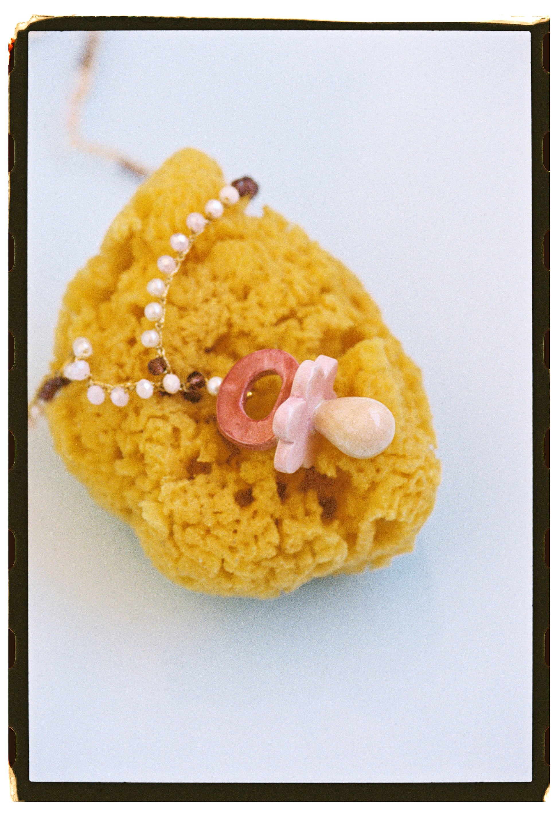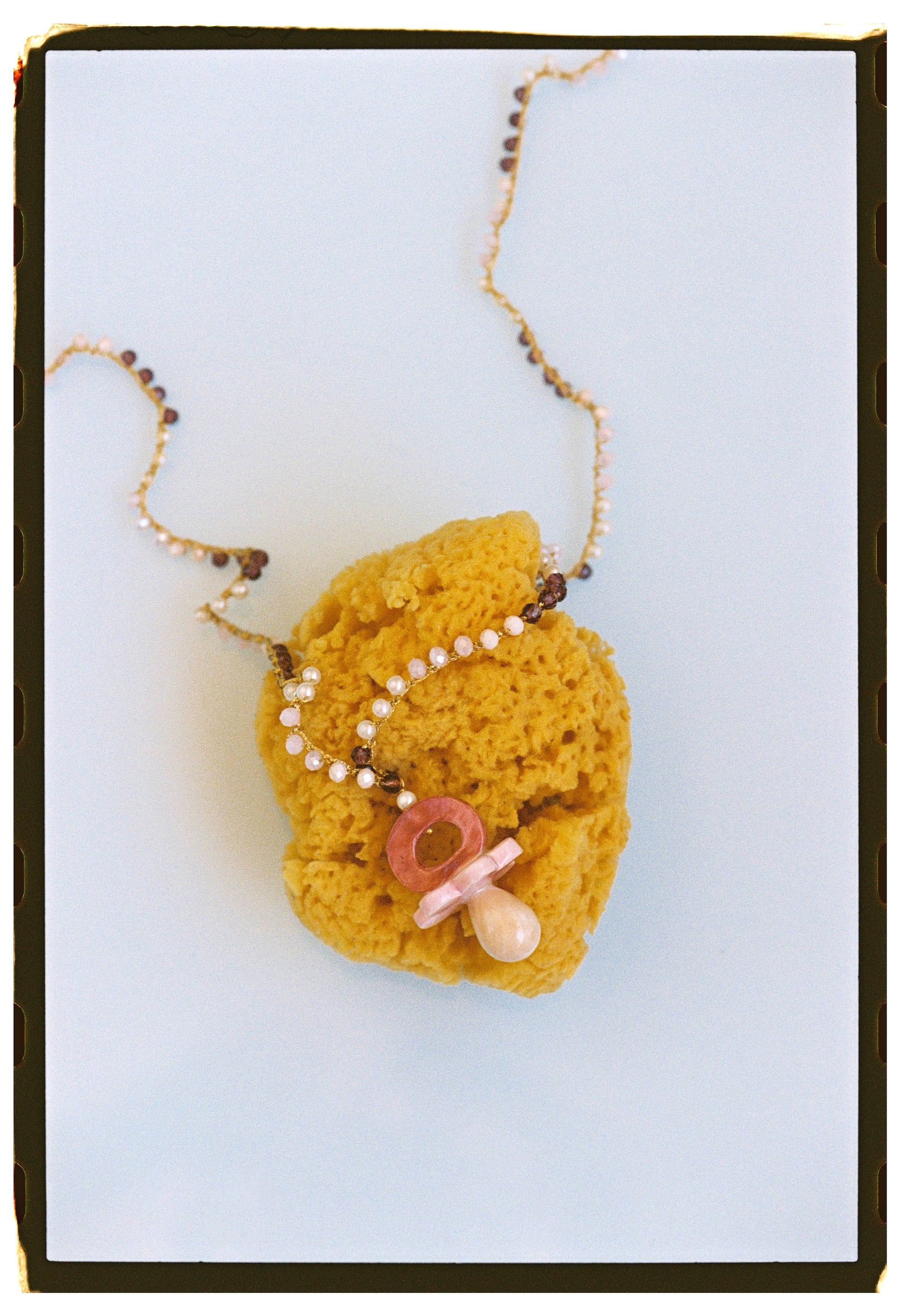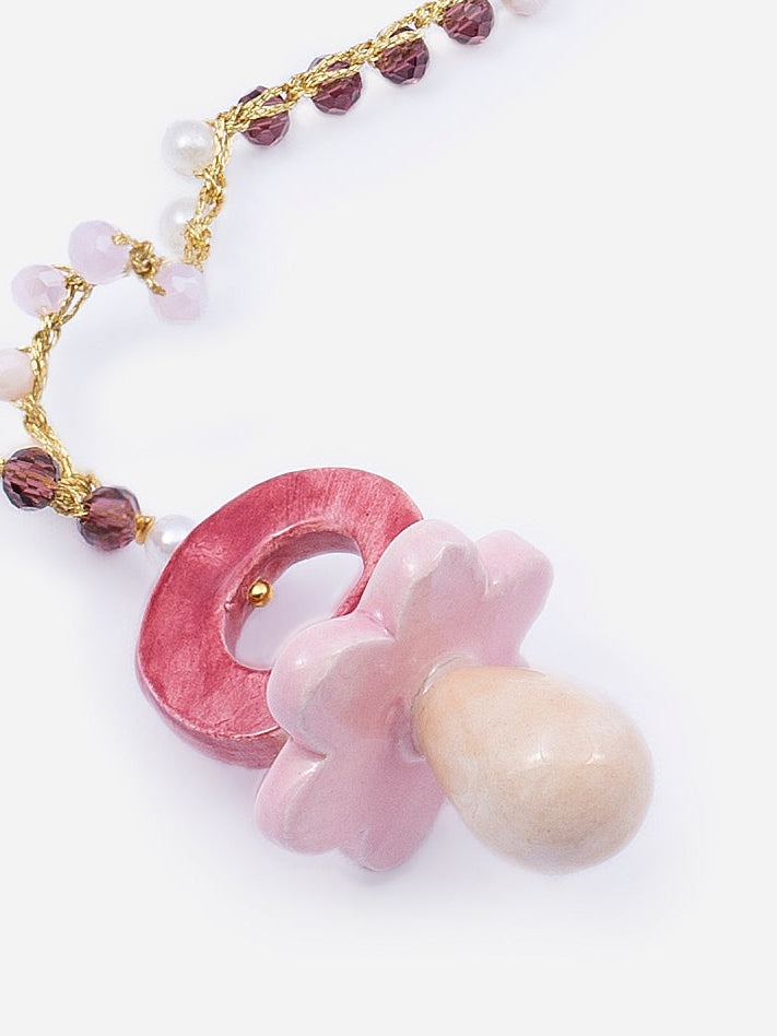 Hecho a mano en Italia, nuestro Collar Chupete es una pieza joyera que combina ternura, humor y mucha artesanía. Su cadena de crochet en hilo de oro está salpicada con piedras circonita de colores y perlas, y culmina en un colgante de cerámica siciliana en forma de chupete—sí, un chupete—, donde la tradición ceramista se transforma en pura fantasía contemporánea.